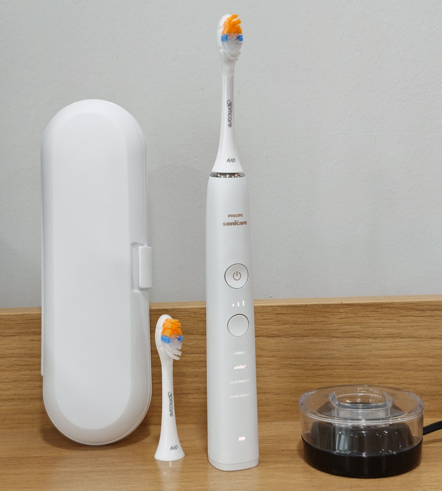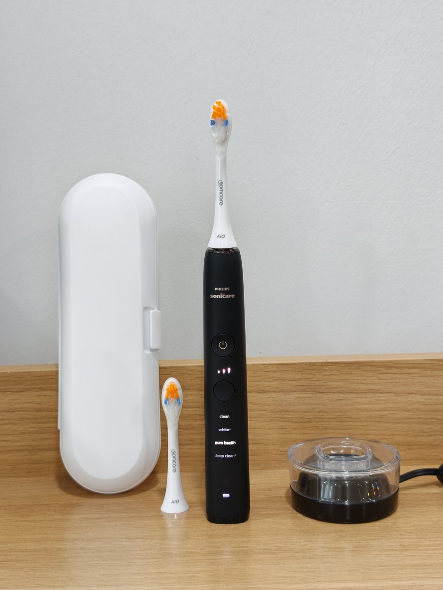 Bộ sản phẩm bao gồm: 1x Thân bàn chải Philips Sonicare DiamondClean 9000 (HX9911) hàng trưng bày, 2x đầu thay AIO All-in-one Mới 100%, 1x sạc pin dòng diamondclean, 1x hộp đựng phụ kiện.