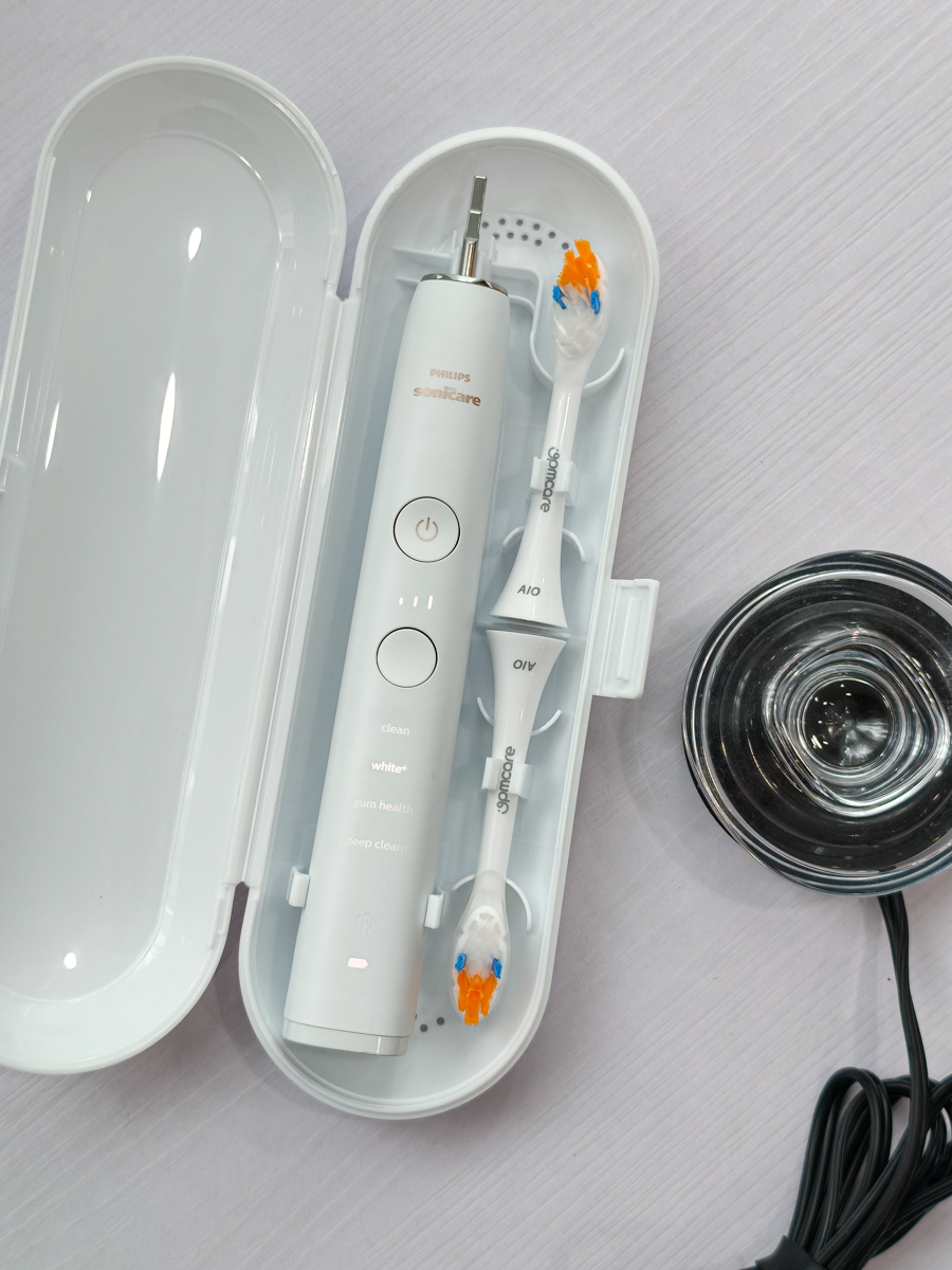 Bộ sản phẩm bao gồm: 1x Thân bàn chải Philips Sonicare DiamondClean 9000 (HX9911) hàng trưng bày, 2x đầu thay AIO All-in-one Mới 100%, 1x sạc pin dòng diamondclean, 1x hộp đựng phụ kiện.