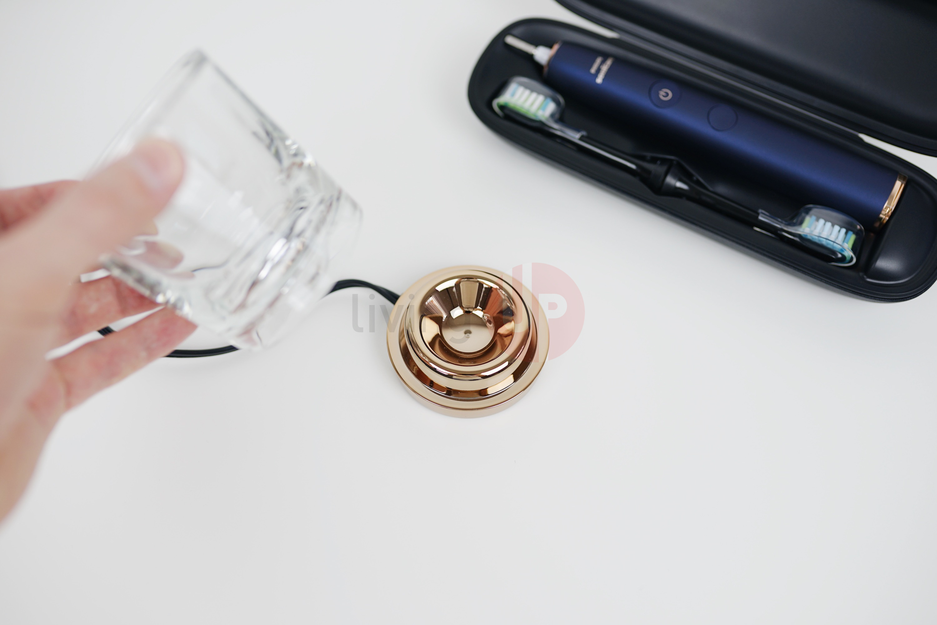 Philips Sonicare 9700 sạc được đựng trong cốc thủy tinh xinh xắn, được kết nối với đế sạc. Nó sử dụng sạc cảm ứng. Vì vậy, để sạc Philips Sonicare 9700, bạn chỉ cần đặt nó vào bên trong cốc.
