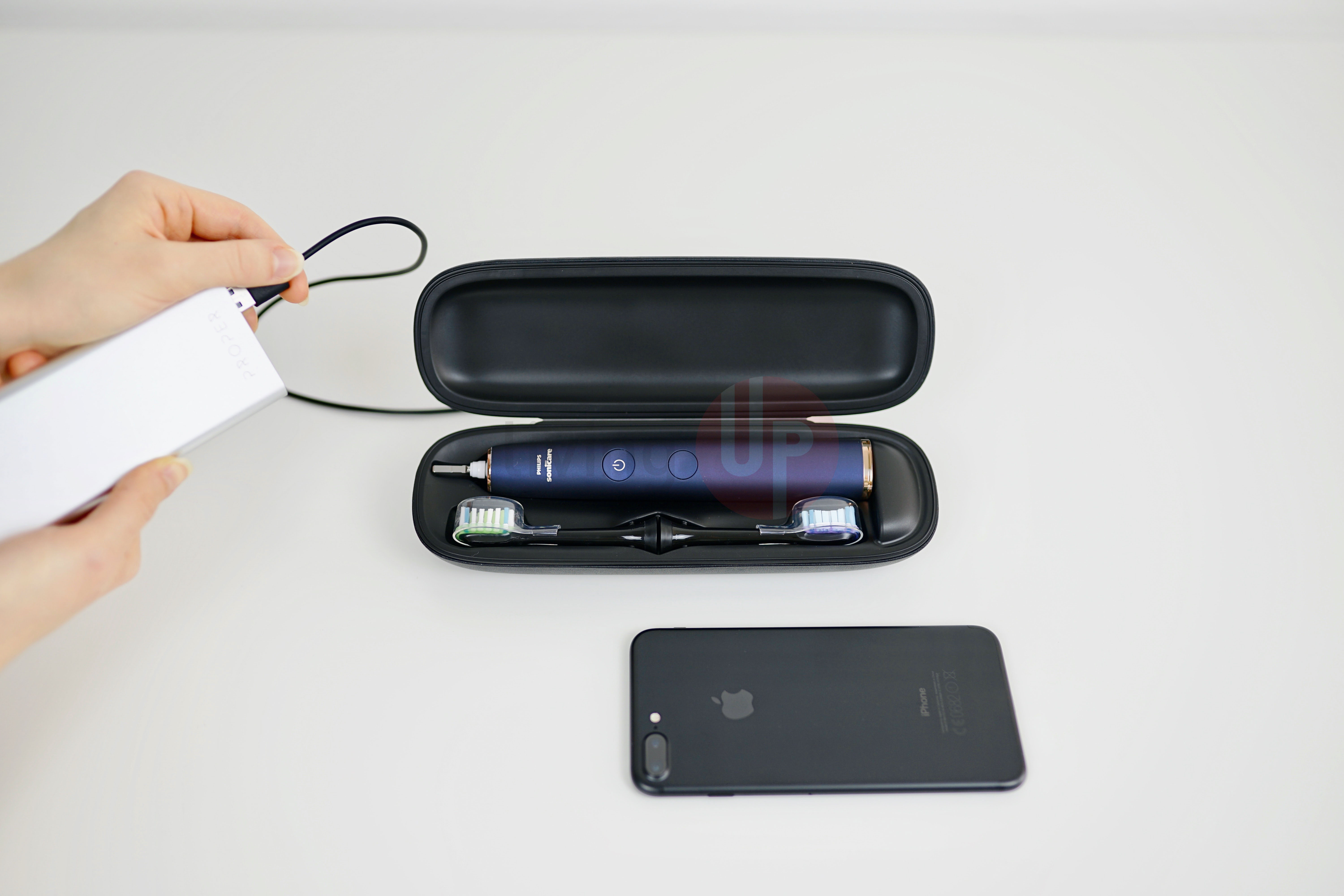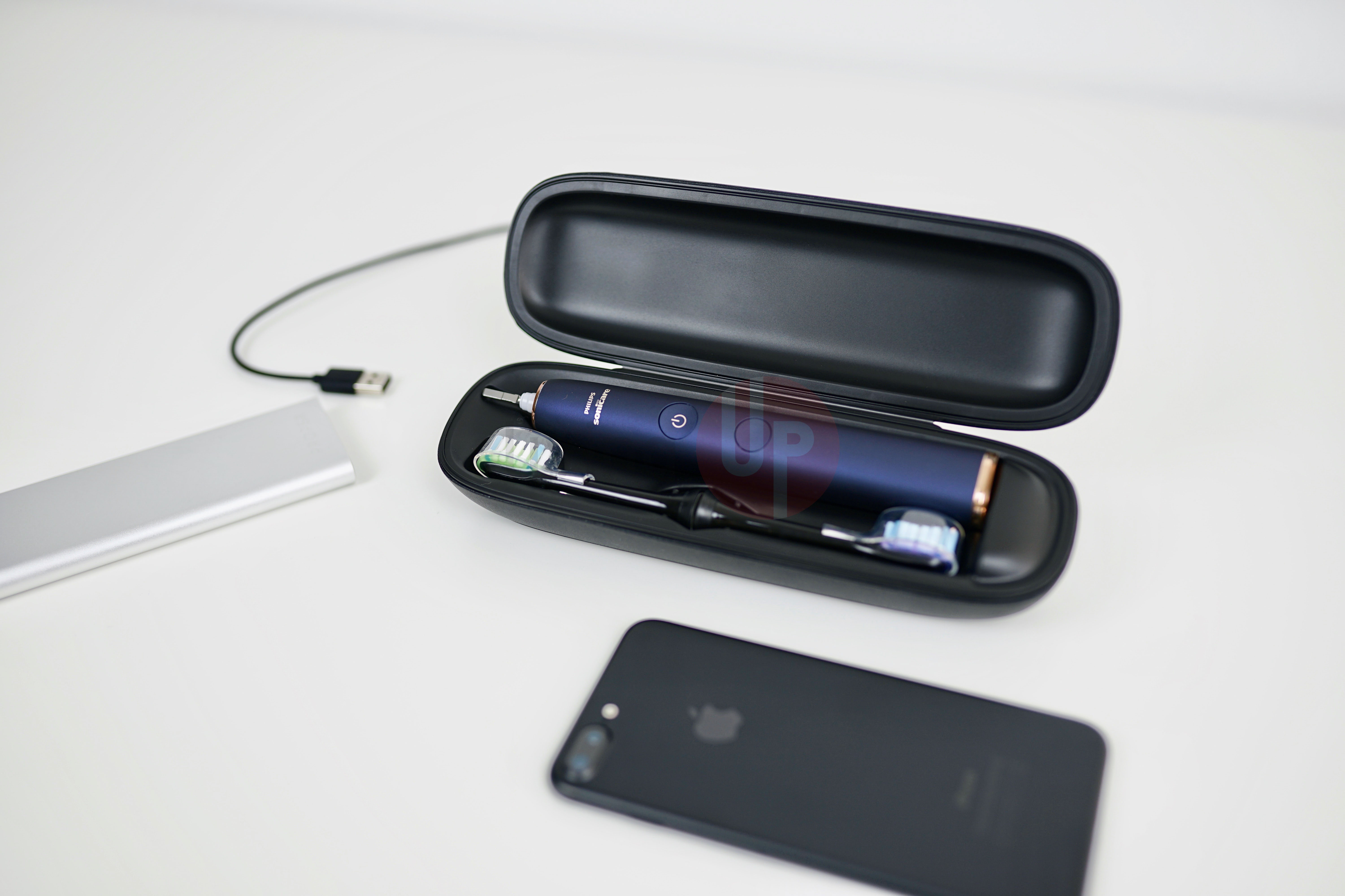 Philips Sonicare 9700 cũng cung cấp cho bạn một hộp đựng du lịch kiểu dáng đẹp với cổng sạc USB. Bộ sạc du lịch được làm bằng cách sử dụng một chất lượng nhựa mềm bọc ngoài. Bên trong, nó có các phần cắt cho chải và 2 đầu chải phụ.