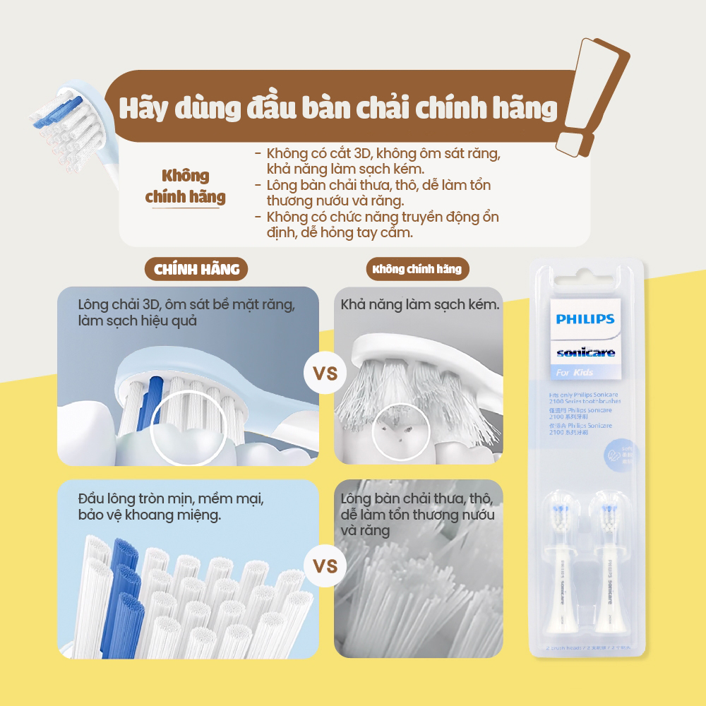 Đầu bàn chải Philips Sonicare 2100 dành riêng cho trẻ em 4–12 tuổi, thiết kế nhỏ gọn, lông chải mềm mịn không gây tổn thương nướu. Chất liệu cao su an toàn thực phẩm, công nghệ cắt 3D ôm sát răng sữa, đầu lông mài tròn bảo vệ nướu. Nha sĩ khuyến nghị thay đầu bàn chải mỗi 3 tháng để đảm bảo hiệu quả vệ sinh tối ưu.