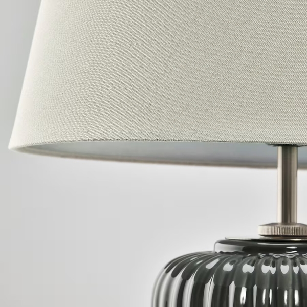 Chiếc đèn bàn này có chân gốm và chụp đèn lan tỏa ánh sáng ấm cúng qua lớp vải màu xám. Với tổng chiều cao là 52 cm, chiếc đèn này là vật trang trí vô cùng bắt mắt kể cả khi bật lẫn khi tắt.