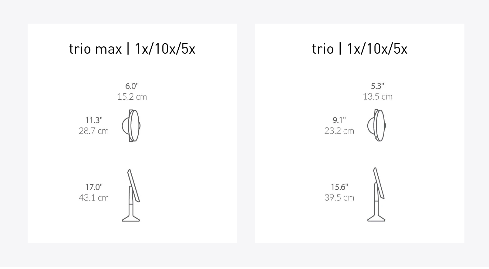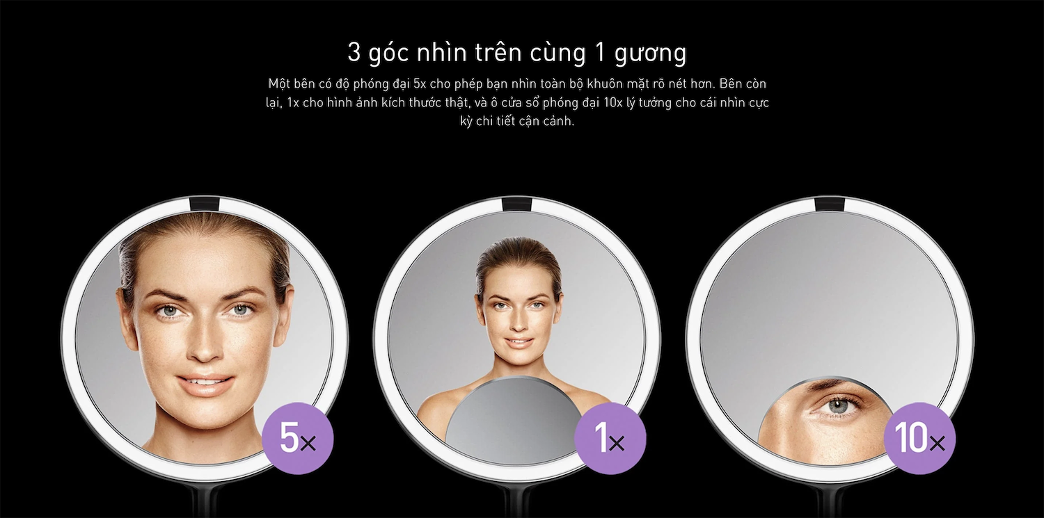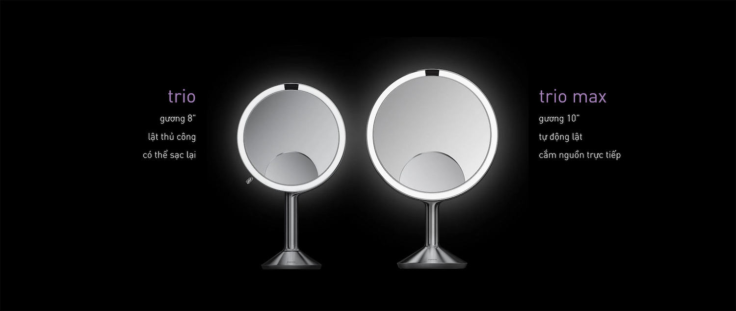 Gương trang điểm cao cấp Simplehuman Trio Max với 2 kích thước tuỳ chọn là 10 inch hoặc 8 inch, gương có khả năng phóng đại từ 1x, 5x, tới 10x phù hợp với mọi nhu cầu trang điểm.