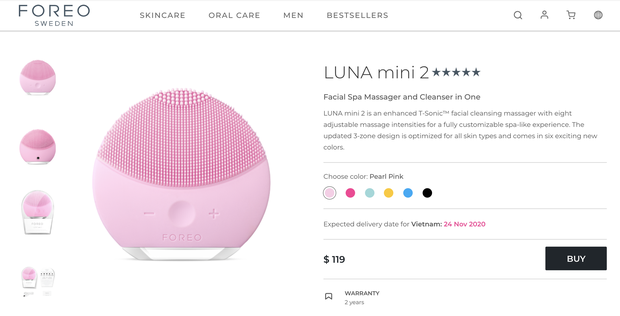 Thông tin từ trang chủ của hãng Foreo - Foreo.com cho thấy Luna Mini 2 có giá tới 119$ ~ 2.8 triệu đồng