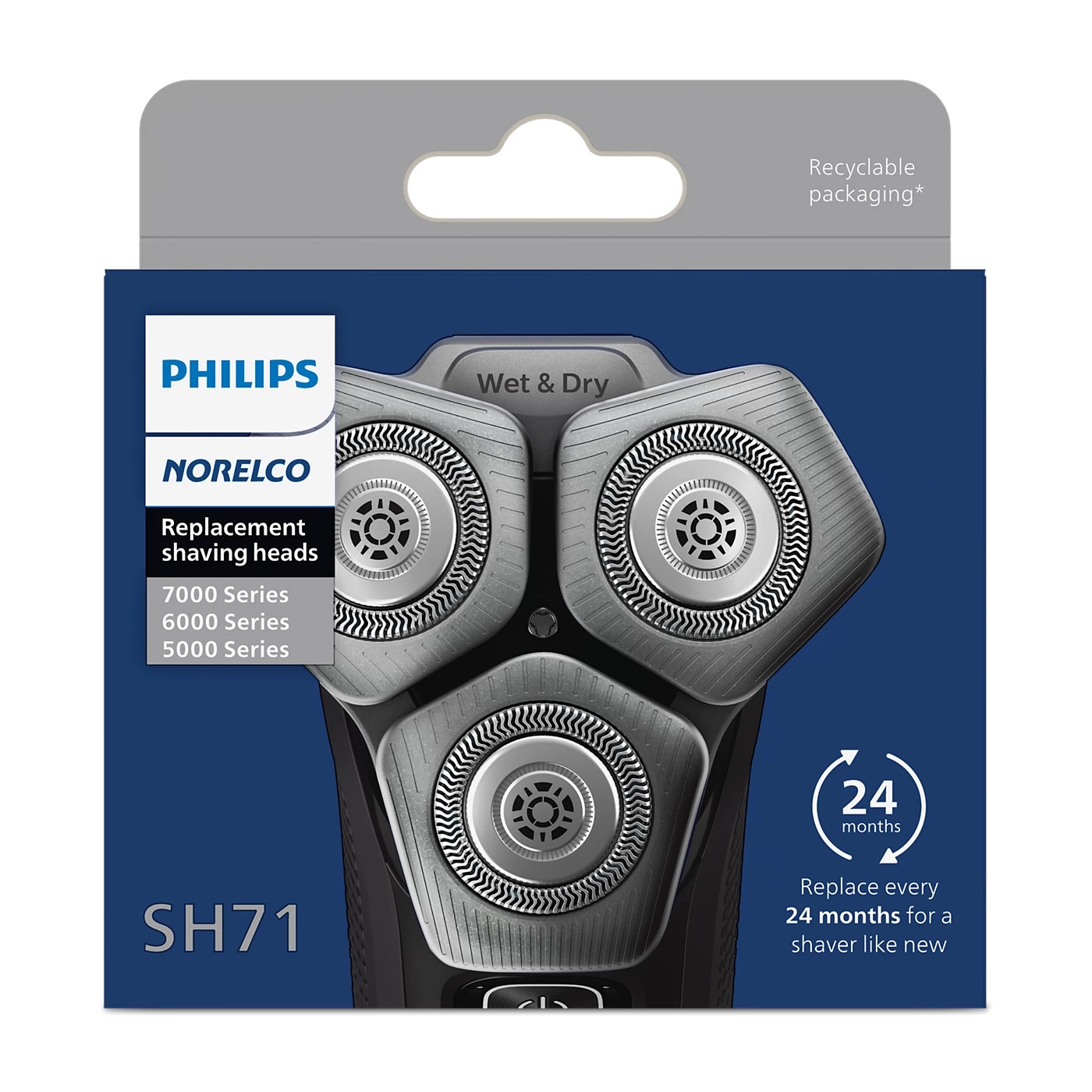 Lưỡi dao thay thế Philips Norelco SH71/52 là bộ lưỡi dao thay thế chính hãng dành cho các dòng máy cạo râu Philips Norelco series 5000, 6000 (dạng góc cạnh) và series 7000. Sản phẩm được trang bị 45 lưỡi dao SteelPrecision tự mài, mang lại đến 90.000 hành động cắt mỗi phút, giúp cạo sạch nhanh chóng và êm ái. Việc thay thế đầu cạo cực kỳ đơn giản, bạn có thể thực hiện tại nhà chỉ với vài bước. Để duy trì hiệu suất tối ưu, Philips khuyến nghị thay đầu cạo SH71/52 sau mỗi 24 tháng. Bao bì sản phẩm thân thiện với môi trường, không chứa nhựa và có thể tái chế. Đây là phụ kiện chính hãng Philips, đảm bảo chất lượng và độ bền vượt trội.