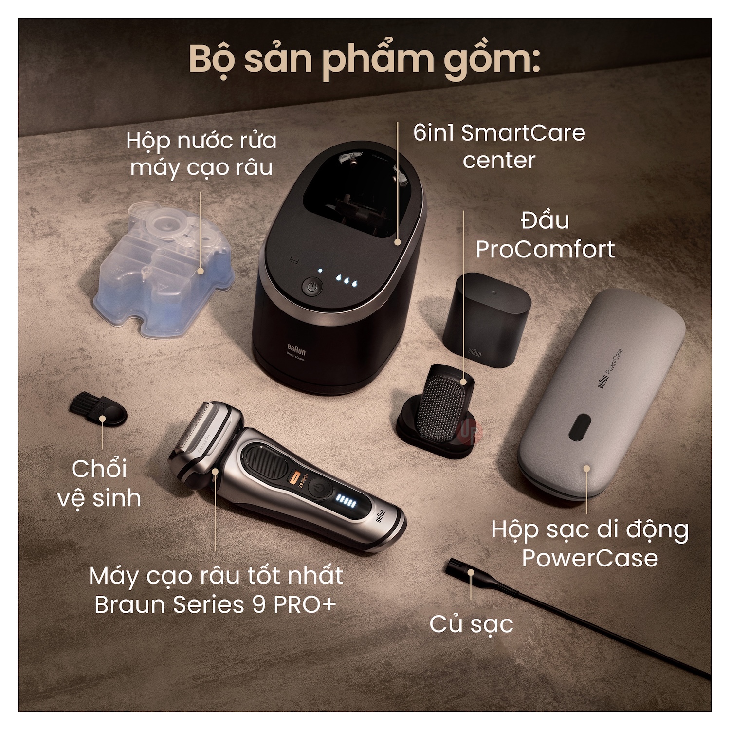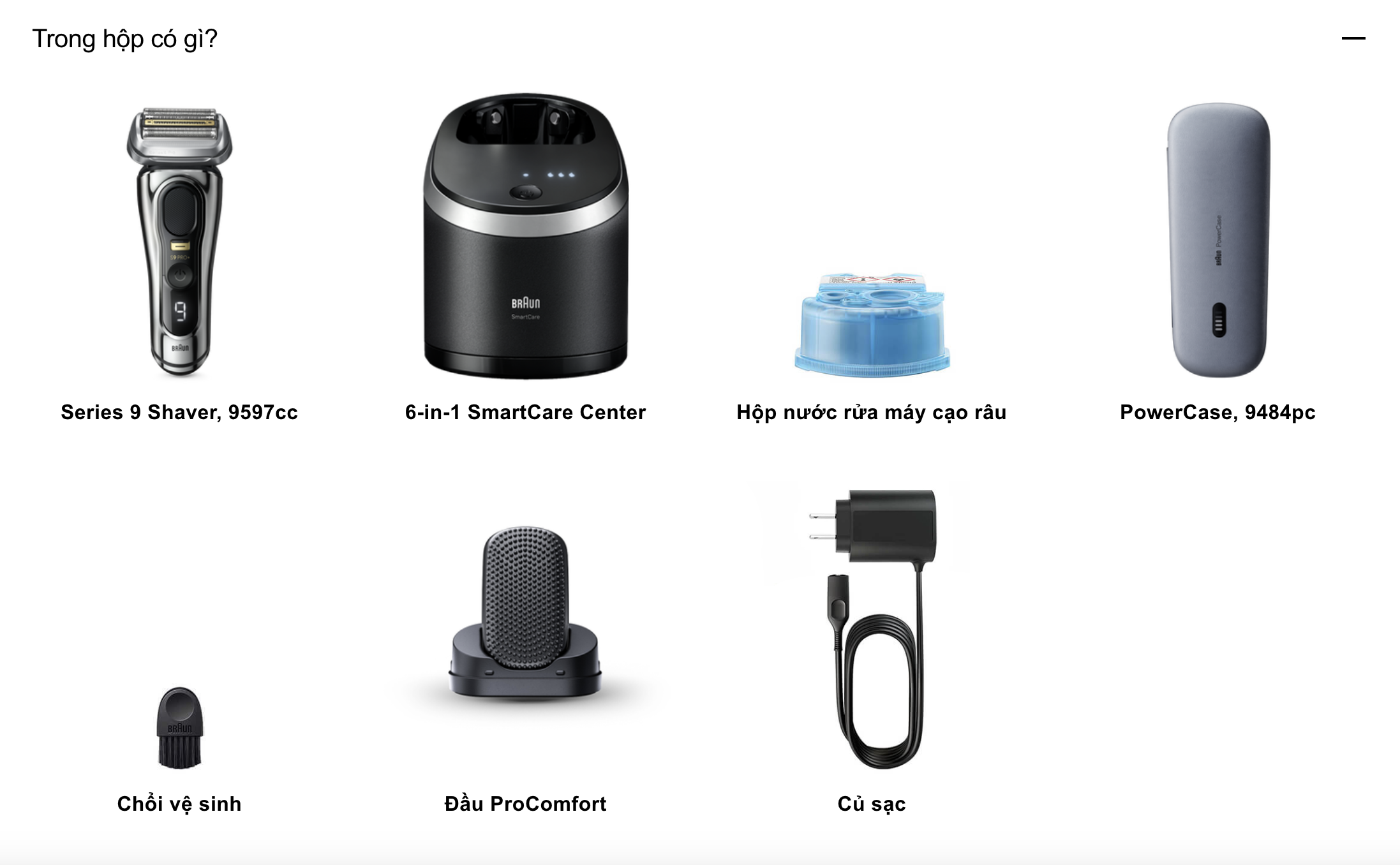 | Bao gồm | Máy cạo, ProComfort Head, SmartCare Center, PowerCase, đế sạc, cáp, cọ vệ sinh, travel case |