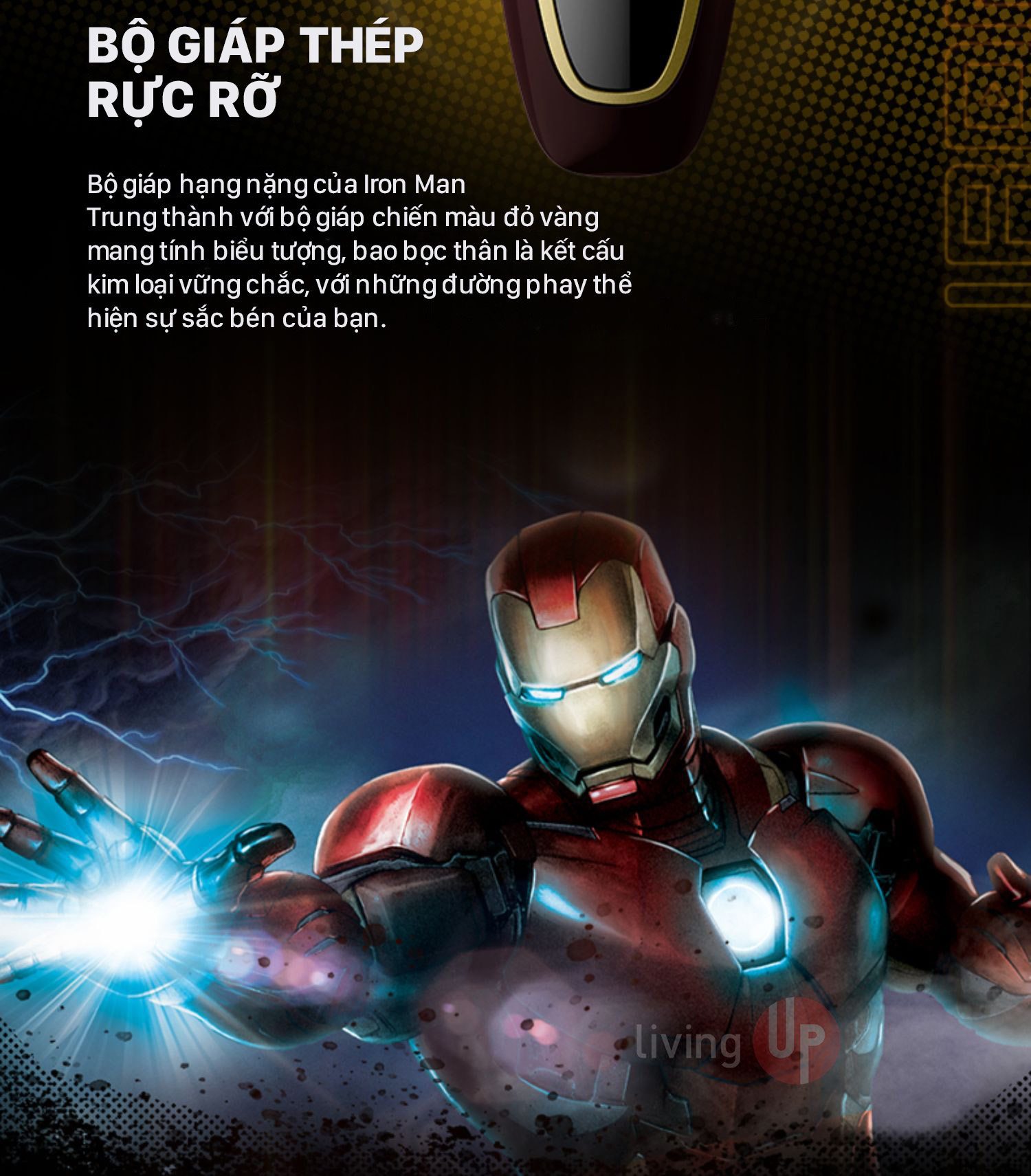 - Thiết kế đặc biệt với màu đỏ và vàng và hình ảnh của nhân vật Iron Man.