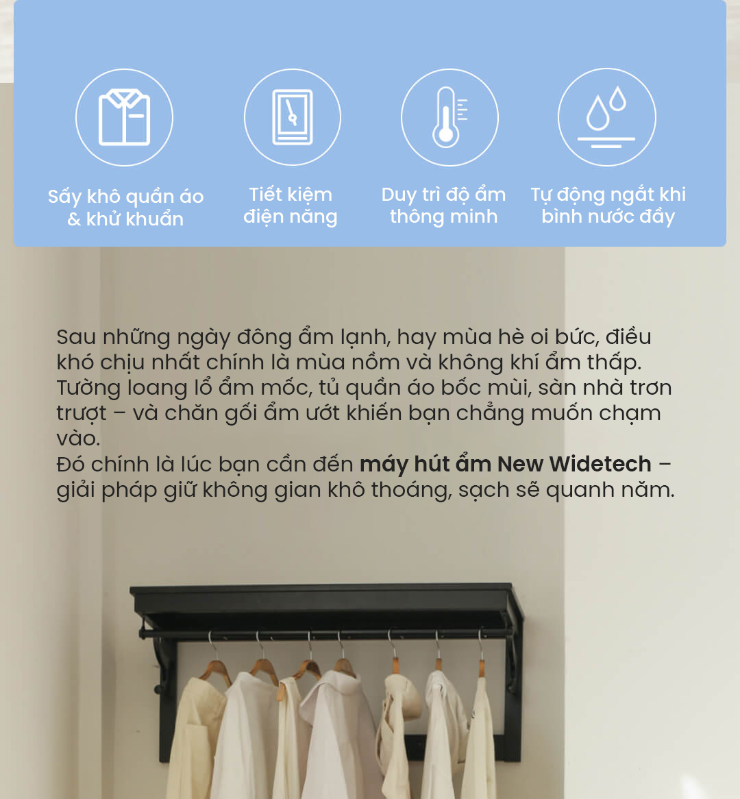 | Tên sản phẩm | Máy hút ẩm thông minh New Widetech 18L |