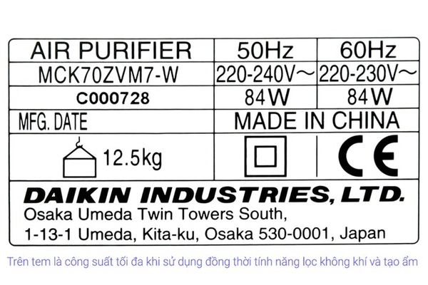 | Tiện ích | Tự khởi động lại khi mất điện, Tạo độ ẩm không khí, Hút gió 3 hướng, Bánh xe di chuyển, Đèn báo chất lượng không khí, Đèn báo hoạt động, Khoá bảng điều khiển |