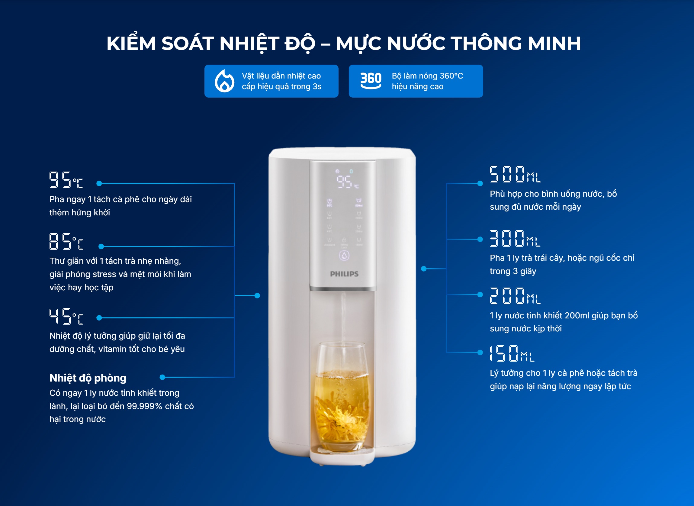| Nhiệt độ nước thực tế | Nóng 45 - 85 - 95°C, nhiệt độ nước thực tế phụ thuộc vào nhiệt độ môi trường và thể tích nước lấy ra |