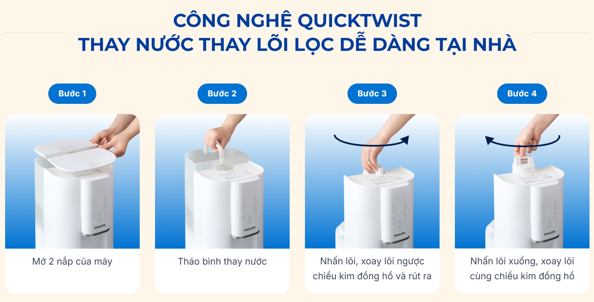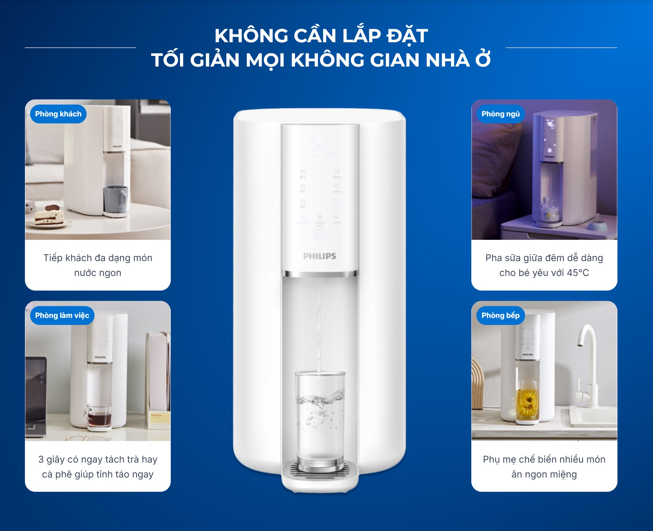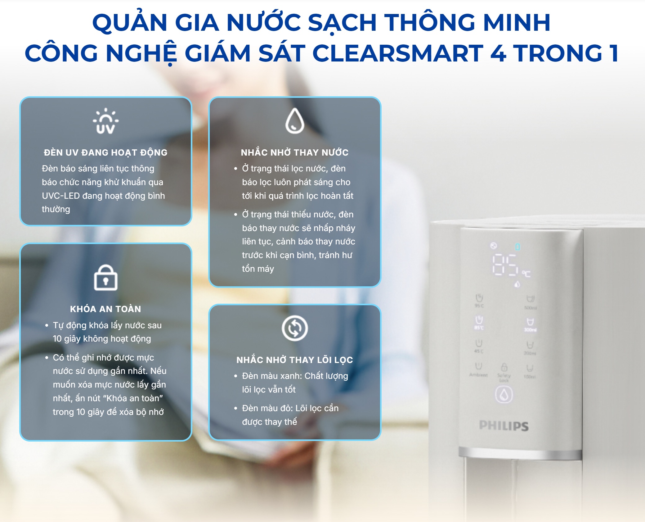 Máy lọc nước RO Philips ADD6901HWH01/74 cải tiến loại bỏ tới 110 loại chất độc hại, cho nguồn nước tinh khiết tương đương nước cất. Công nghệ làm nóng tức thời trong 3 giây, 4 mức nhiệt và 4 mức dung tích linh hoạt, dùng cho cà phê, trà hay nước ấm hằng ngày. Bộ lọc bền đến 12 tháng, tích hợp UV diệt 99,9% vi khuẩn, khóa an toàn chống bỏng, màn hình ClearSmart thông minh. Cắm điện là dùng, không cần lắp đặt.