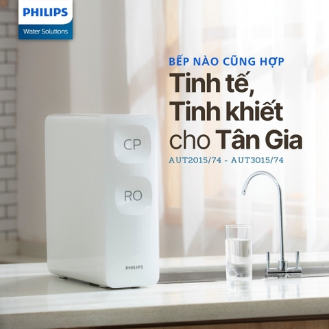 Máy lọc nước RO Philips AUT2015 trang bị 2 lõi lọc AquaShield, cho 2 dòng nước đầu ra gồm nước RO tinh khiết uống trực tiếp và nước lọc sạch dùng cho sinh hoạt. Hệ thống RO lọc đến 0.0001 micron, loại bỏ 99.99% vi khuẩn, công suất 60 lít/giờ. Thiết kế không bình chứa mỏng gọn, lõi QuickTwist dễ thay, tích hợp cảm biến rò rỉ an toàn cho gia đình.