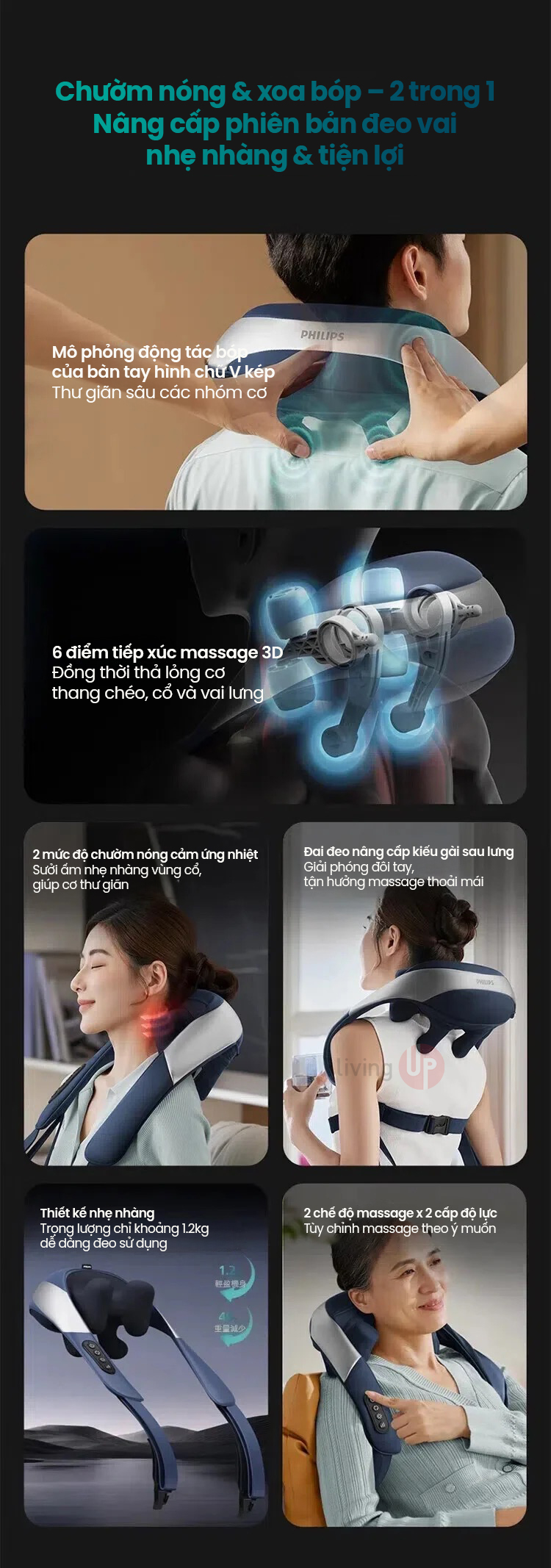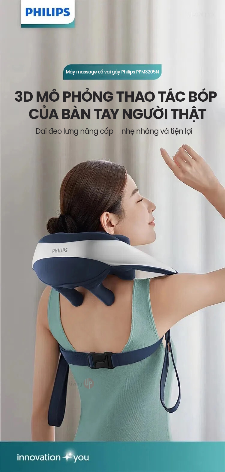 Máy massage cổ vai gáy Philips PPM3205N thiết kế đeo vai tiện lợi, massage 3D mô phỏng tay người, tích hợp chườm nóng 2 mức nhiệt, nhẹ chỉ 1.2kg, dùng không dây đến 90 phút. Thư giãn sâu, dễ sử dụng, phù hợp mọi lứa tuổi.