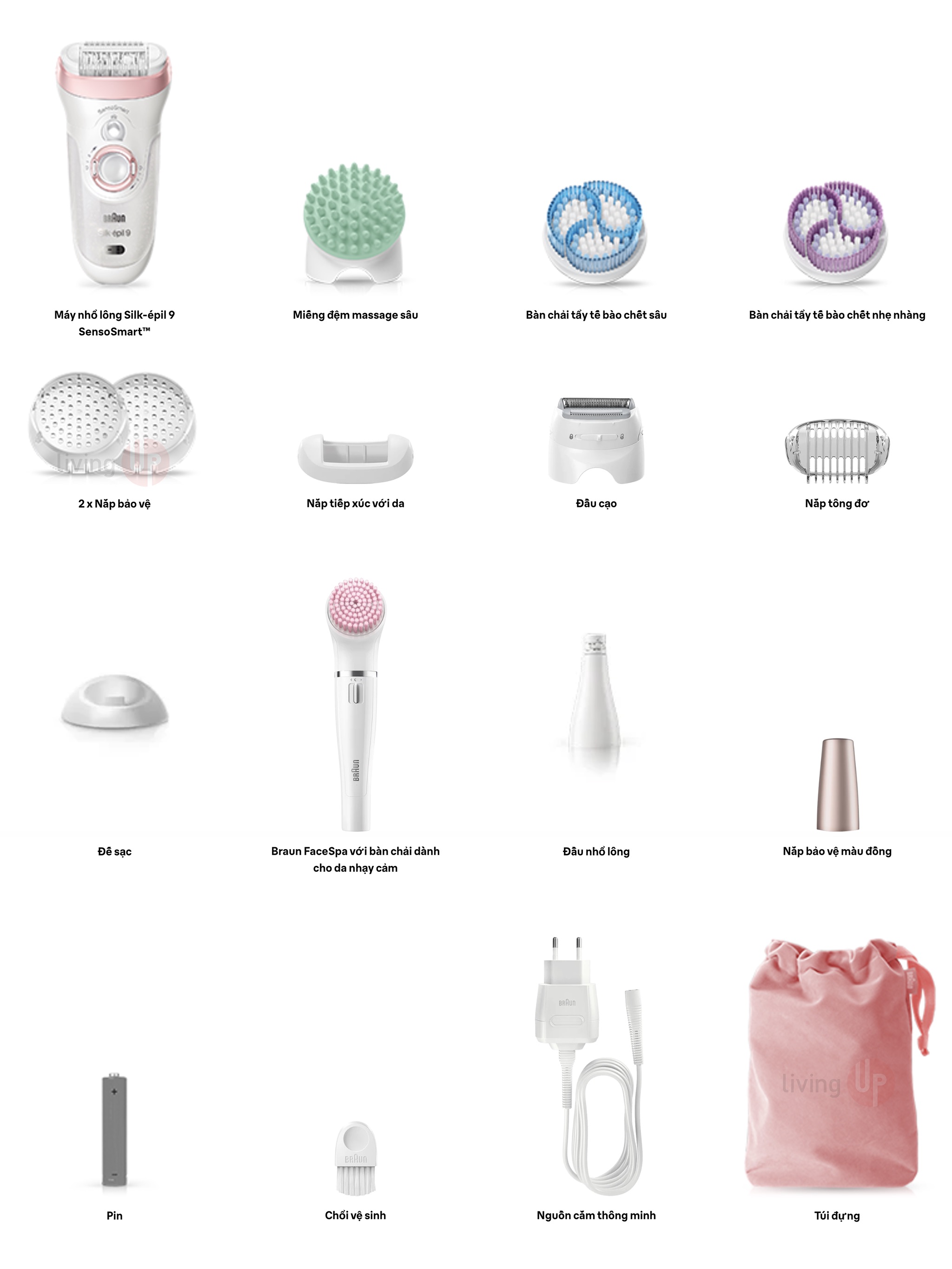 | Attachment bao gồm | 1 epilator chính + 3 đầu body massage/exfoliate + 1 đầu shaver + 1 trimmer + 1 đầu FaceSpa epilator + 3 đầu brush FaceSpa + 1 sponge làm đẹp |