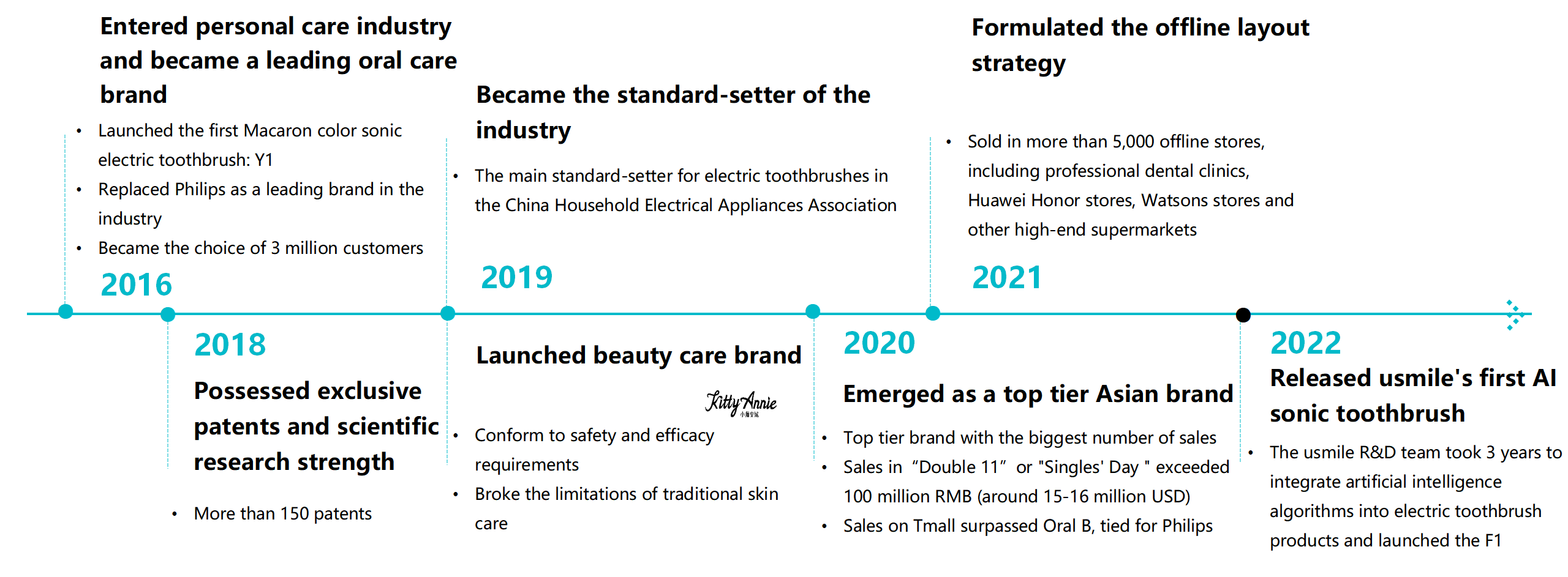 Usmile - một thương hiệu với năm thành lập vào năm 2015 - đã khẳng định vị thế của mình trong lĩnh vực chăm sóc răng miệng hiện đại. Với sự phát triển không ngừng, usmile đã tạo nên một dòng sản phẩm toàn diện, từ bàn chải đánh răng điện với công nghệ sóng âm, tăm nước, đến kem đánh răng, chỉ nha và nước súc miệng. Usmile đã được thử nghiệm và chứng minh rằng mang lại hiệu quả cao và sự thoải mái tối đa cho người dùng. Hiện tại Usmile đã dành được 17 giải thưởng quốc tế về công nghệ, trên 450 bằng sáng chế trong lĩnh vực điện tử và đã có hơn 22 triệu người sử dụng. Usmile là một trong những thương hiệu uy tín về chăm sóc răng miệng trên Amazon. Thương hiệu này không chỉ chinh phục được thị trường nội địa tại Trung Quốc mà còn được tôn vinh trên toàn cầu sau gần một thập kỷ phát triển.