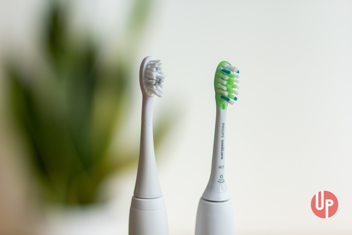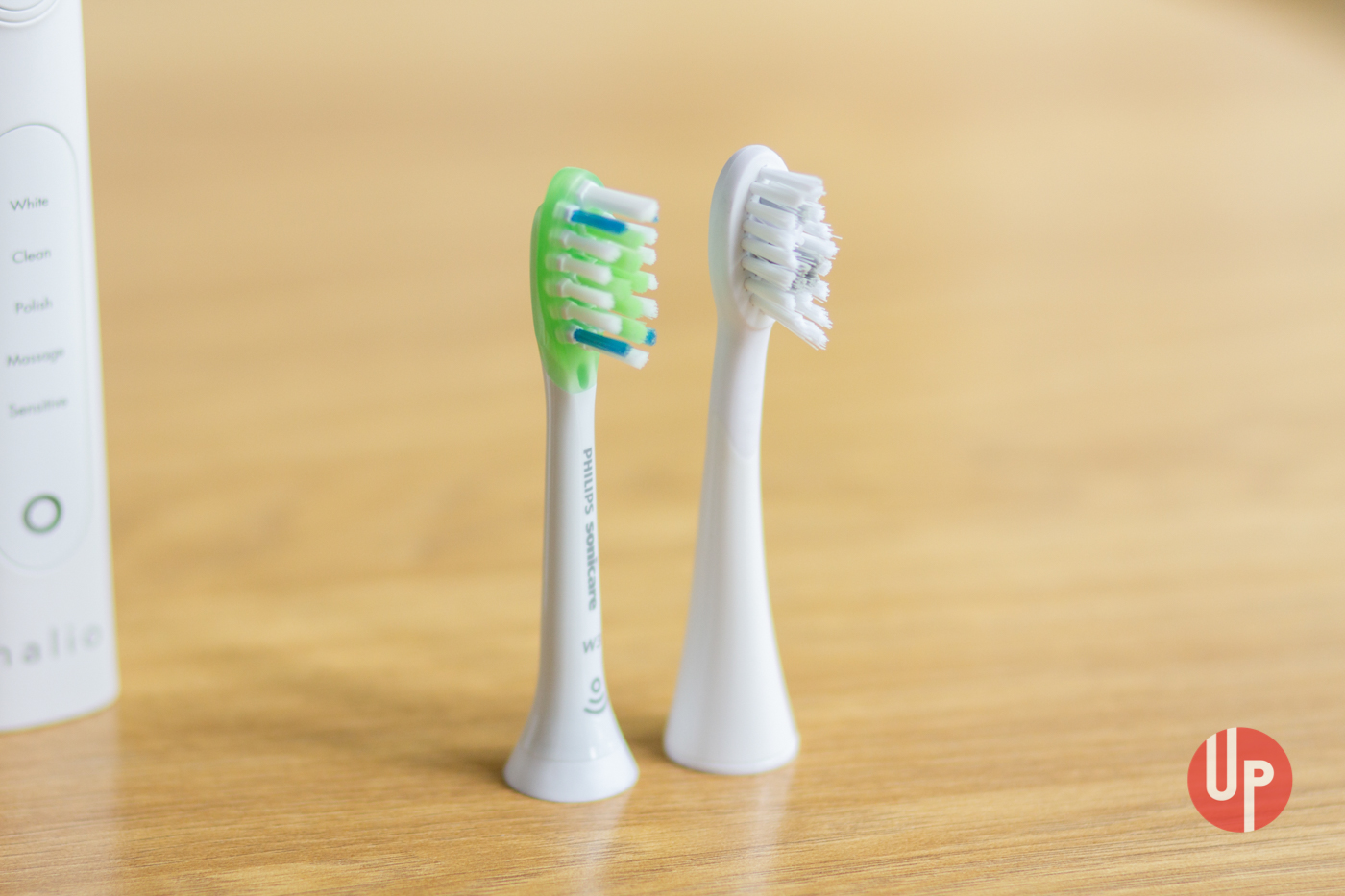 So sánh đầu bàn chải mặc định theo máy, quan sát mắt thường có thể thấy bên Philips đầu bàn chải mảnh hơn, mật độ sợi lông rất dày so với đầu của Halio thì sợi dầy hơn, mật độ lông cũng thưa thớt hơn. Điều này có nghĩa là trên cùng một diện tích tiếp xúc thì đầu bàn chải của Philips có mật độ sợi lông dày hơn, như vậy sẽ có hiệu quả cao hơn trong việc làm sạch hoặc đánh bóng răng. Đầu bàn chải của Philips cũng có tính năng thông minh, tự đồng bộ với thân máy để lựa chọn chế độ chải, nhắc thay đầu bàn chải khi hết hạn khuyến cáo sử dụng.