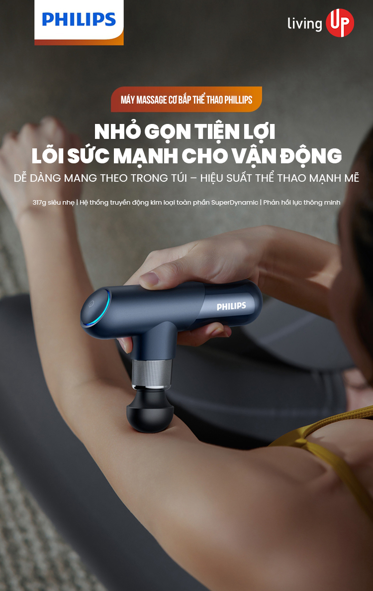 Súng massage thể thao mini Philips PPM7501 nhỏ gọn này là một công cụ hữu ích cho những người tập thể dục thường xuyên. Với động cơ mạnh mẽ, máy có thể cung cấp công suất 10kg đáng kinh ngạc ở độ sâu massage 0.8cm, rất phù hợp để làm nóng và phục hồi cơ thể sau khi vận động thể thao