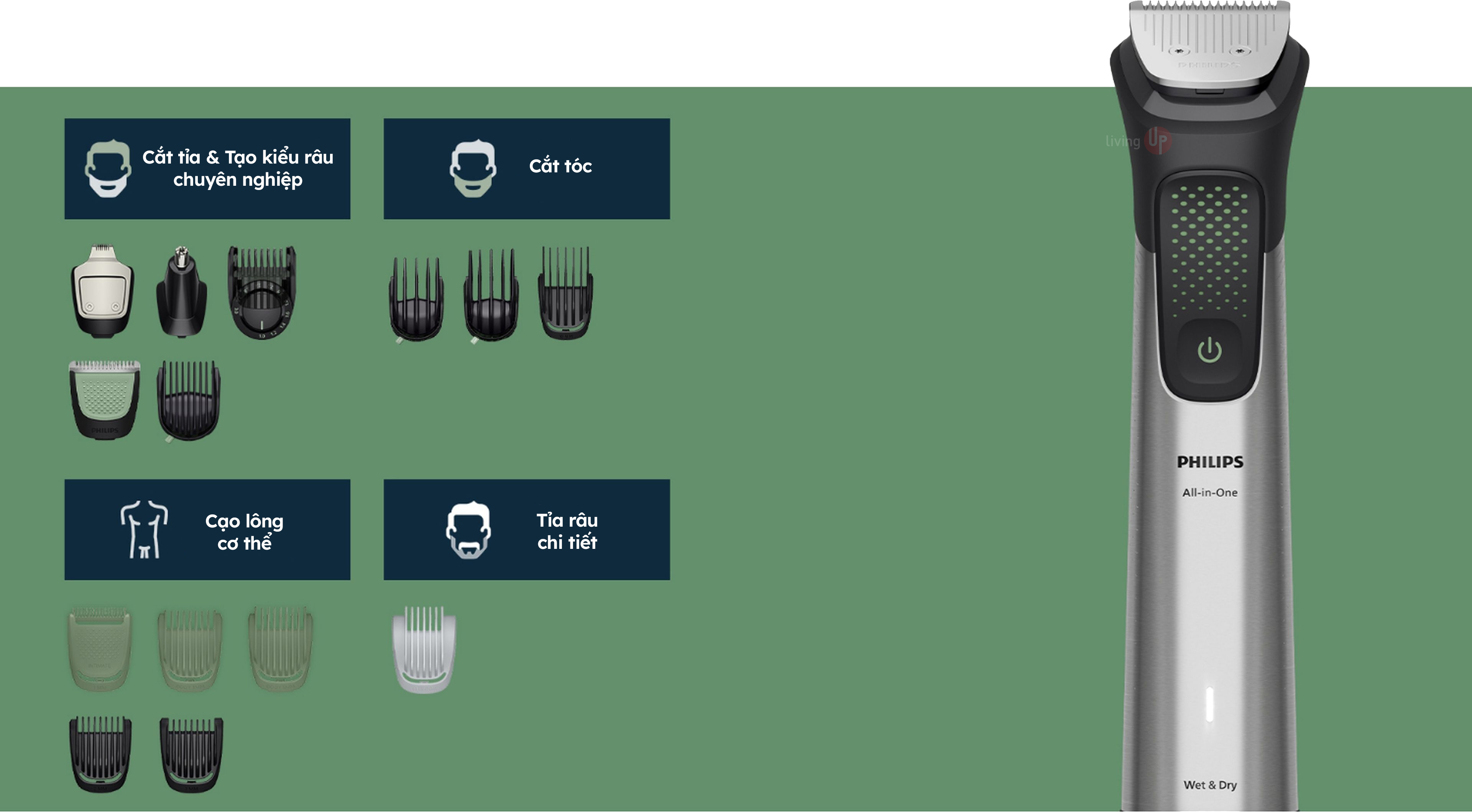 | Các công cụ tạo kiểu | Chuyên dụng | • Đầu tỉa bằng kim loại • Máy tỉa lông mũi • Đầu tỉa chi tiết • Máy tỉa lông • Lưỡi cắt tự mài bén • Công nghệ BeardSense • Lược chính xác cao cấp |