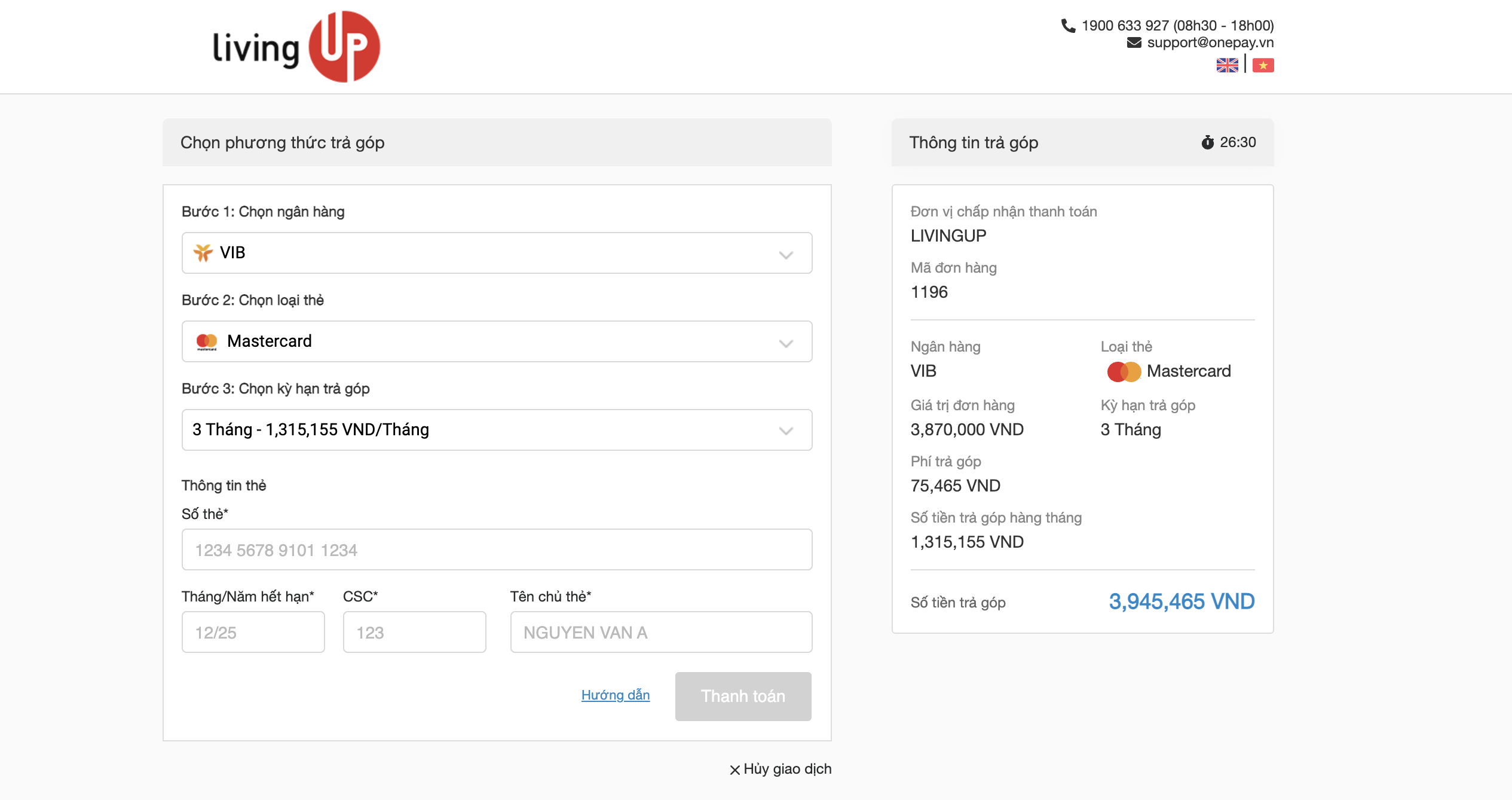 Trở lại ví dụ giao dịch ban đầu, lúc này số tiền bạn trả góp sẽ là 12 triệu + phí chuyển đổi do tổ chức tín dụng quy định. Lấy ví dụ tại LivingUp hiện tại đang sử dụng dịch vụ của Onepay, Onepay tính phí chuyển đổi cho kì hạn 3 tháng trung bình là 1,9%