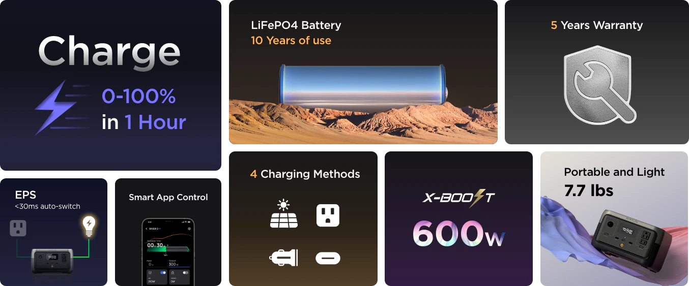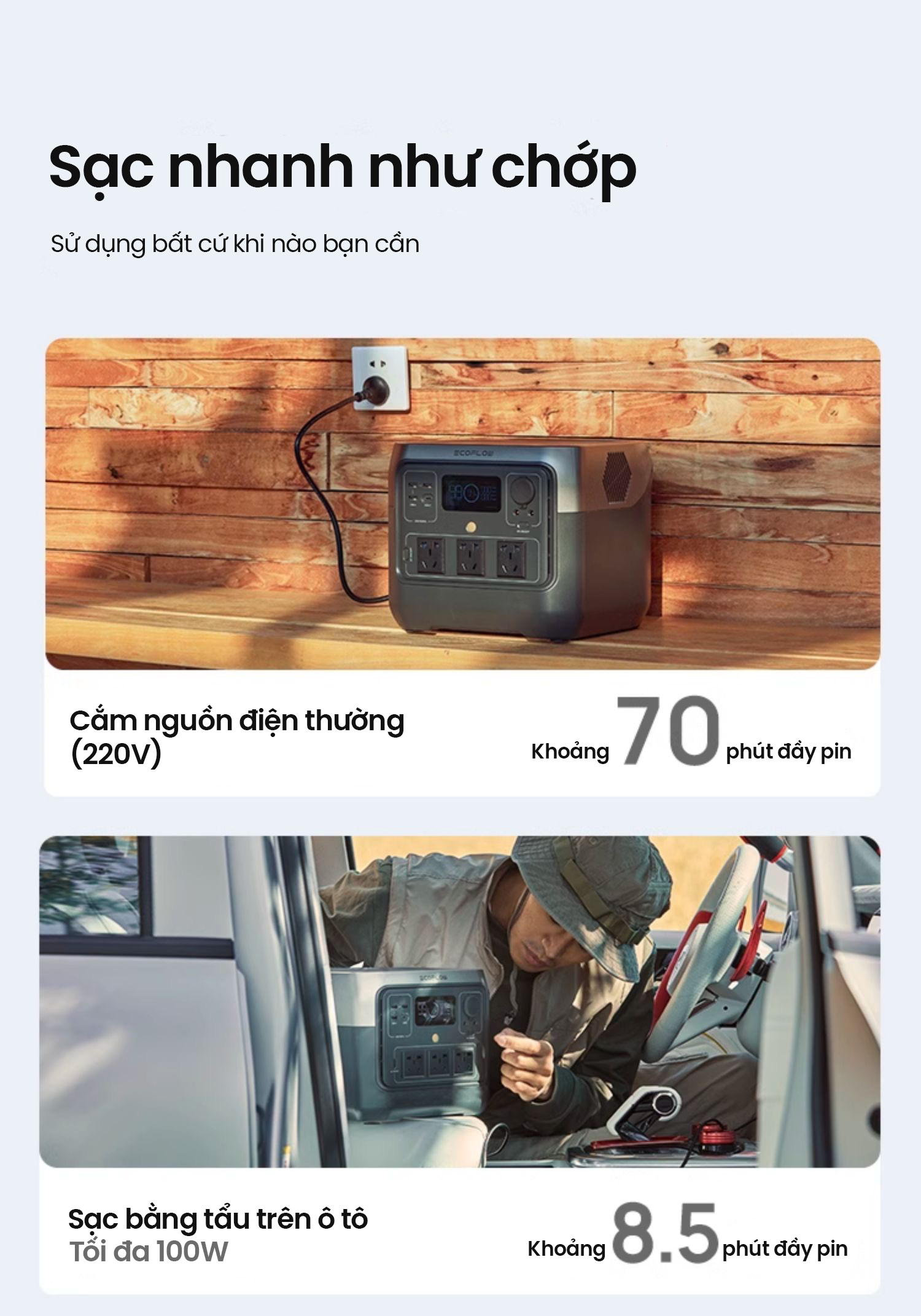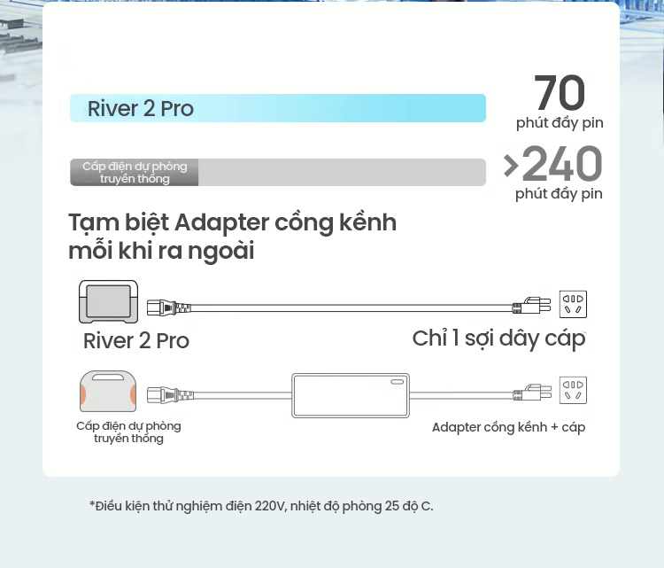 RIVER 2 Pro Với khả năng sạc cực nhanh, bạn sẽ luôn sẵn sàng cho chuyến đi xa tiếp theo hoặc mất điện đột ngột. Sạc 0-100% bằng ổ cắm AC chỉ trong 70 phút. Nó nhanh hơn năm lần so với tiêu chuẩn ngành và nhanh hơn 27% so với thế hệ trước.