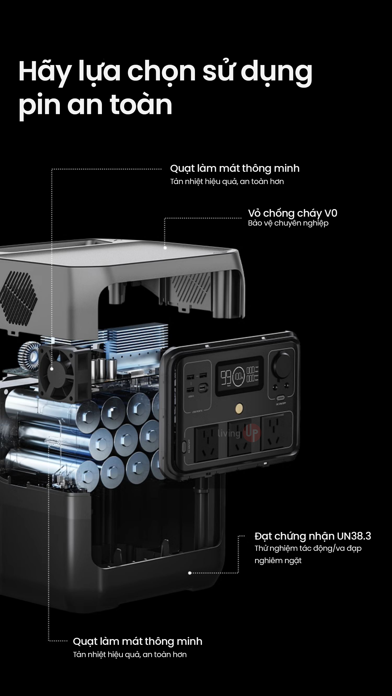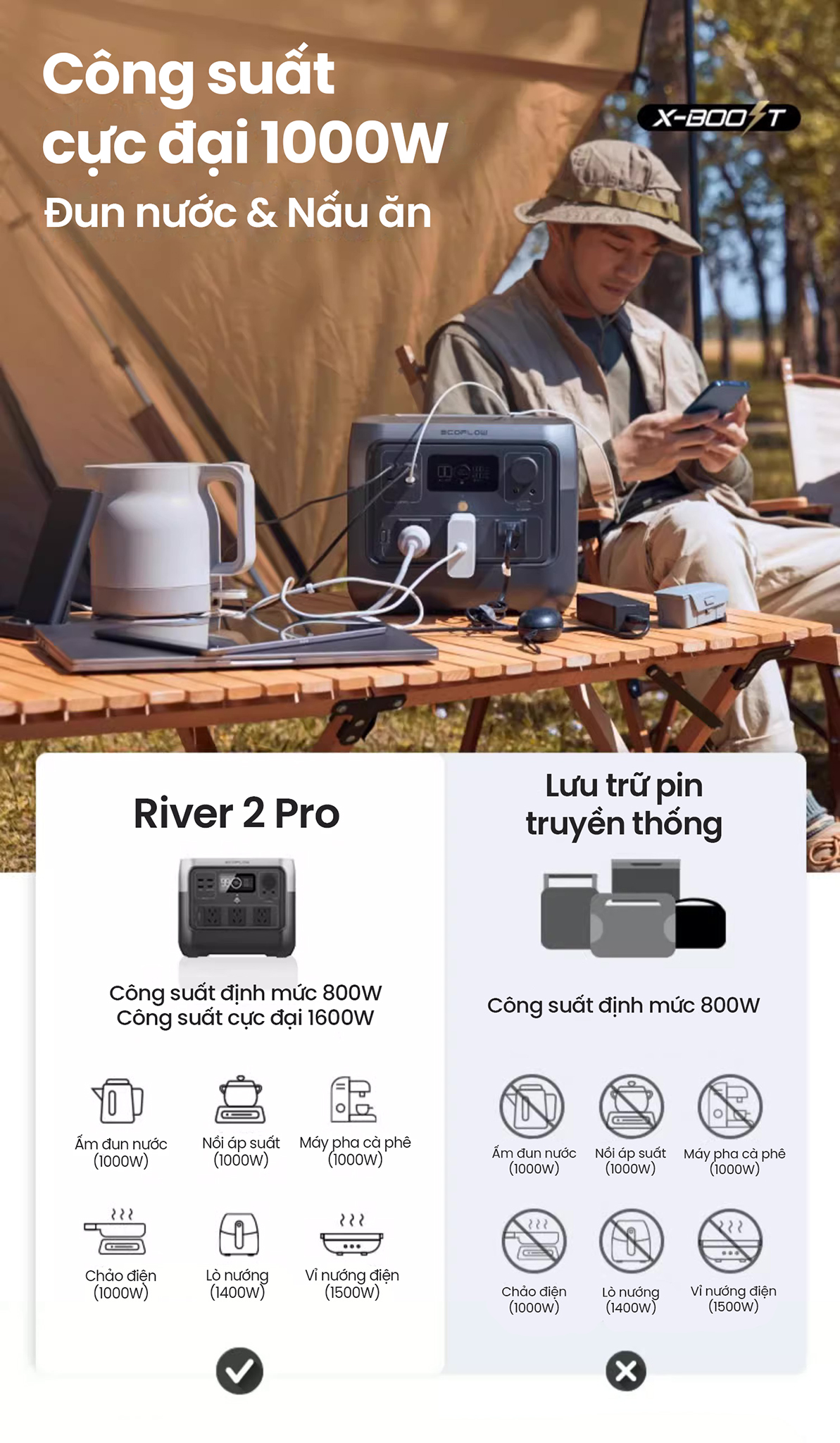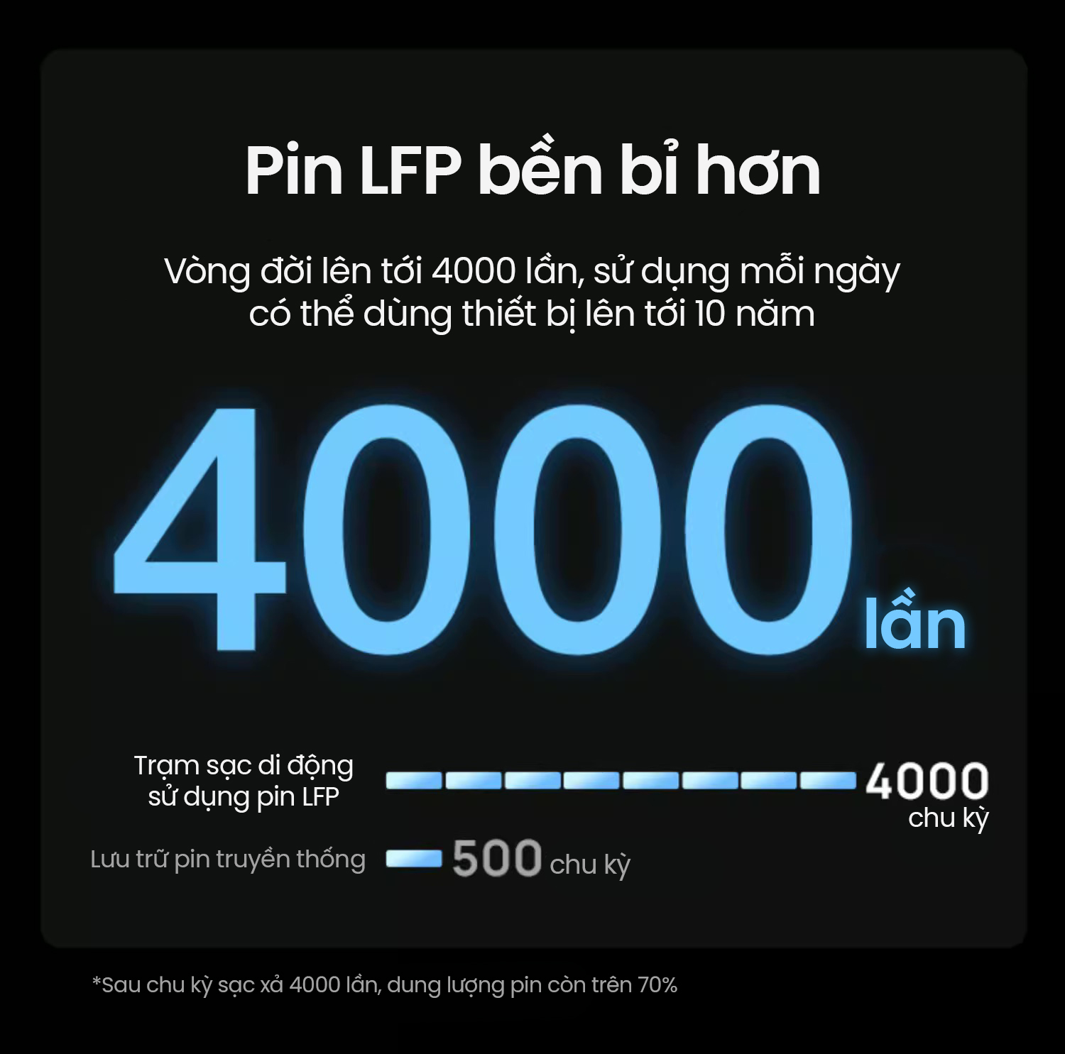 RIVER 2 Pro Với hơn 3000 chu kỳ 100% pin, bạn có thể sử dụng RIVER 2 Pro hầu như mỗi ngày trong gần mười năm. Hóa chất pin LFP không chỉ mang lại tuổi thọ cao. Nó đáng tin cậy, hiệu quả và an toàn hơn ngay cả ở nhiệt độ cao. RIVER 2 Pro có một trong những chế độ bảo hành dài nhất trong ngành.